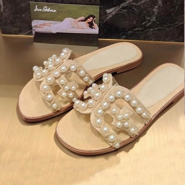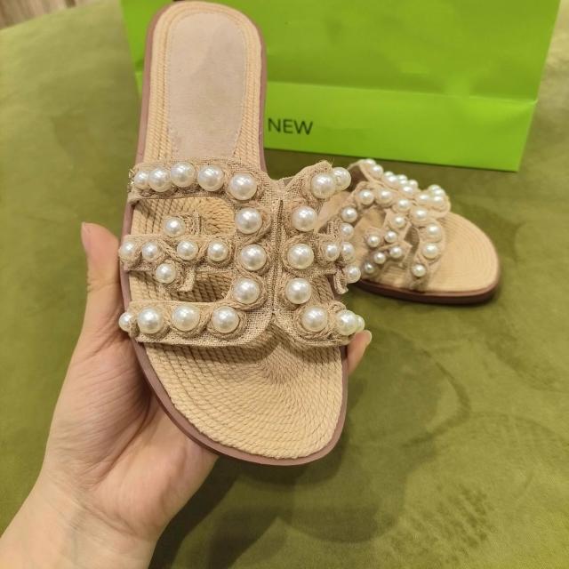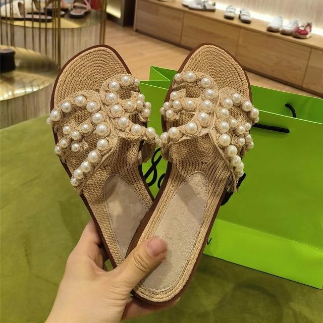 免運 免稅 現貨~虞書欣同款法式珍珠草編一字拖鞋女夏外穿高級感沙灘平底拖