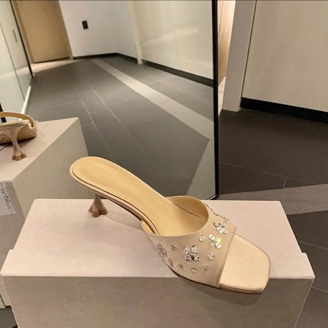 免運 免稅 現貨秒發!韓版百搭方頭花瓣水鉆珠片綢緞小貓跟涼鞋拖鞋女外穿夏