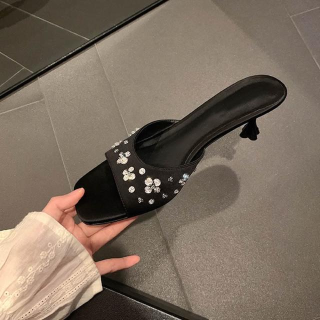 免運 免稅 現貨秒發!韓版百搭方頭花瓣水鉆珠片綢緞小貓跟涼鞋拖鞋女外穿夏