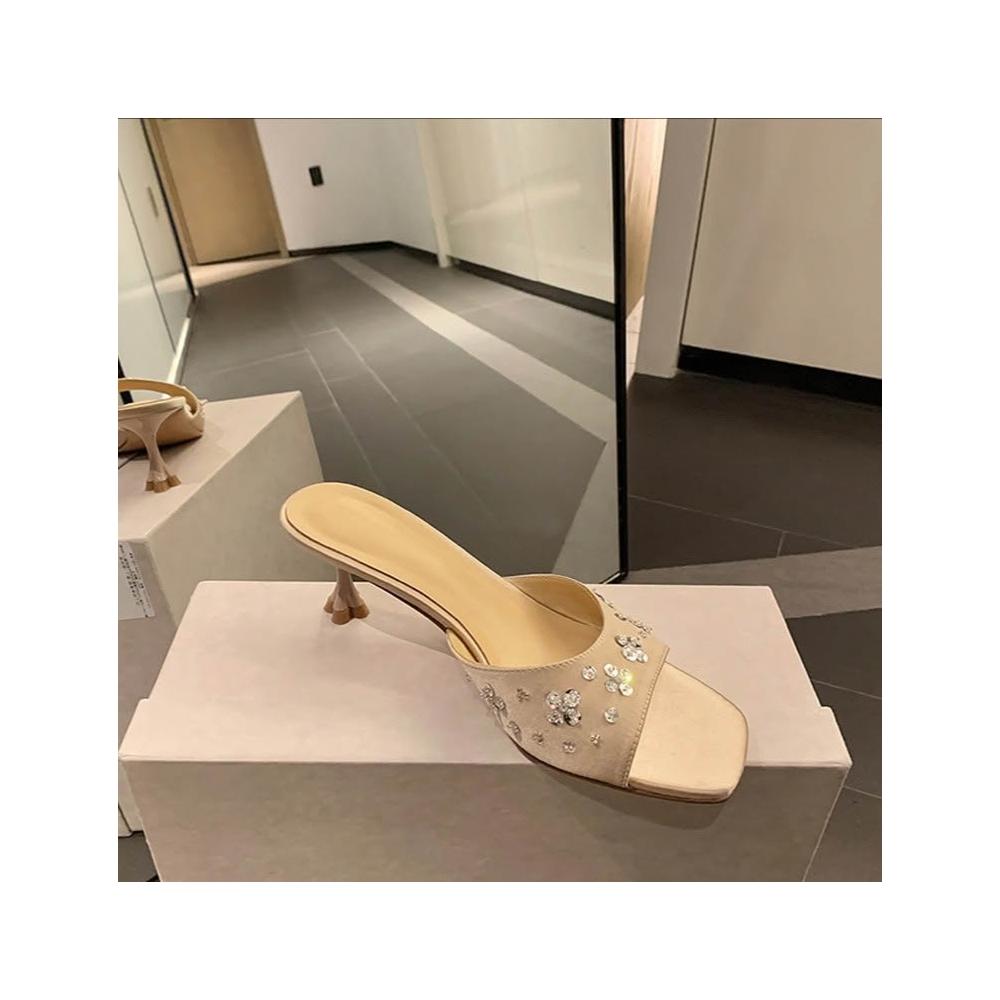 免運 免稅 現貨秒發!韓版百搭方頭花瓣水鉆珠片綢緞小貓跟涼鞋拖鞋女外穿夏