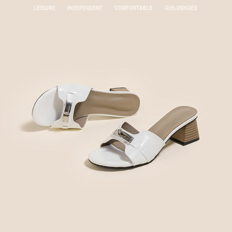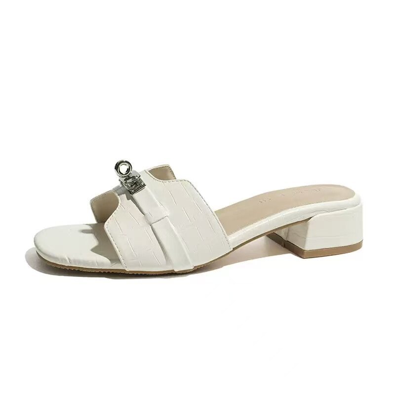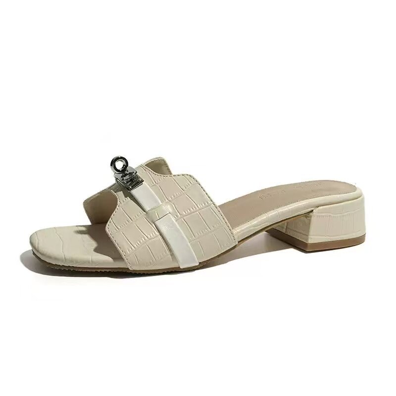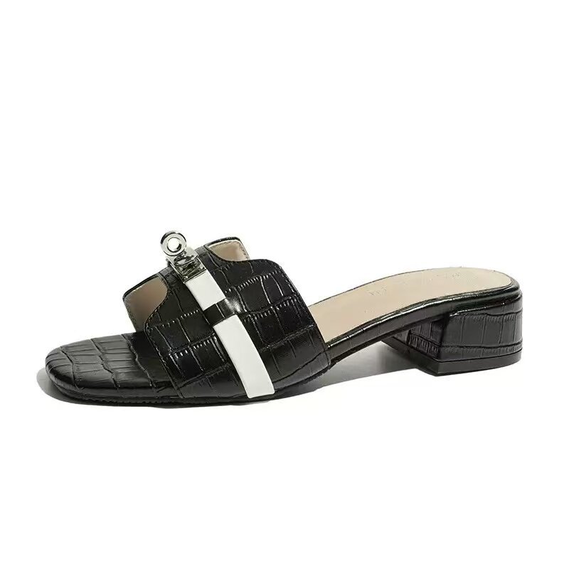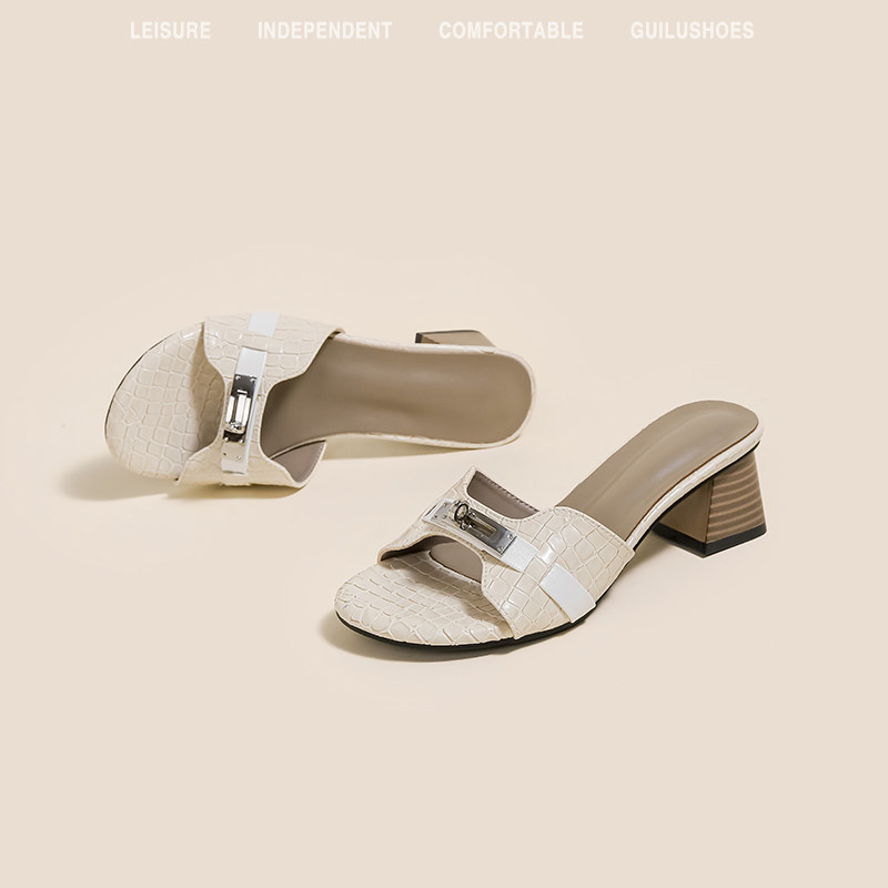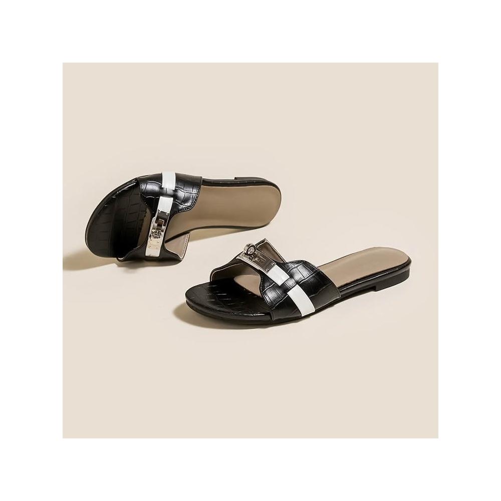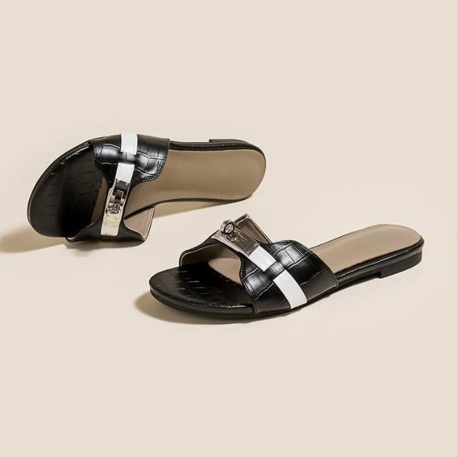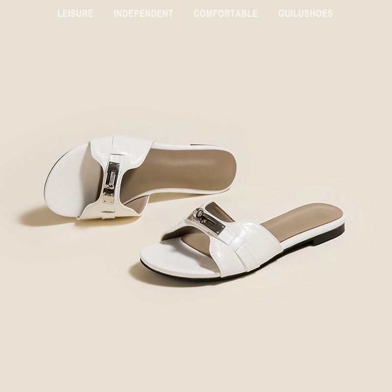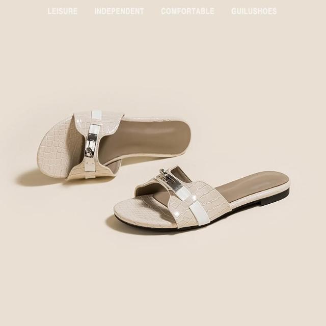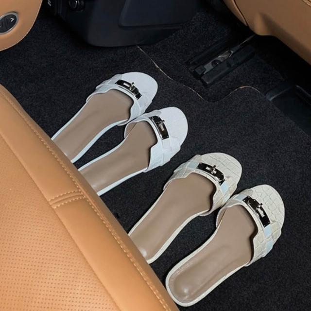 免運 免稅 羊皮版~小金扣鳄魚紋法式一字拖鞋女夏季外穿涼拖軟底沙灘半拖鞋