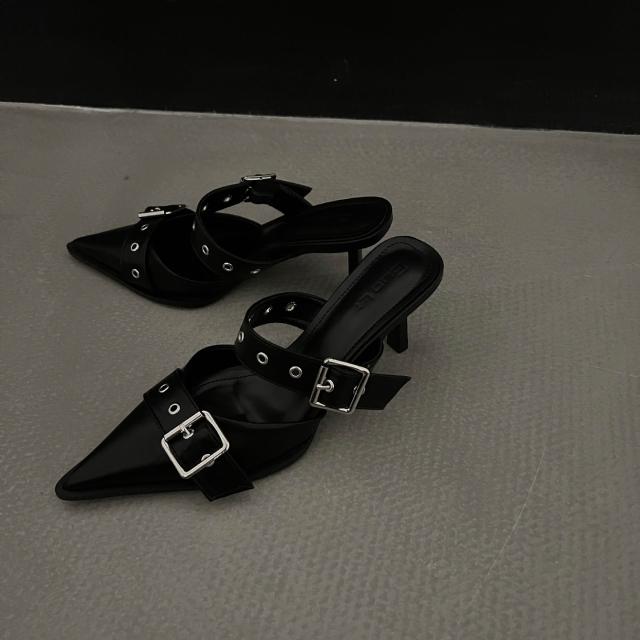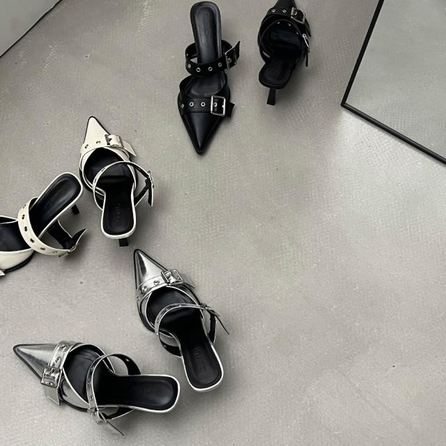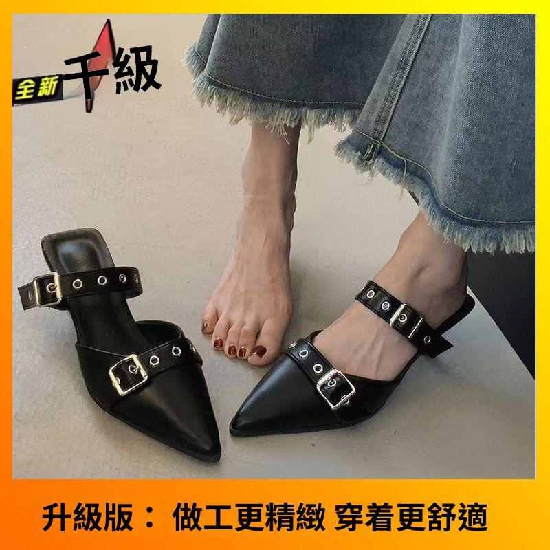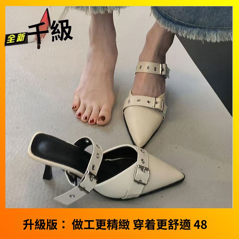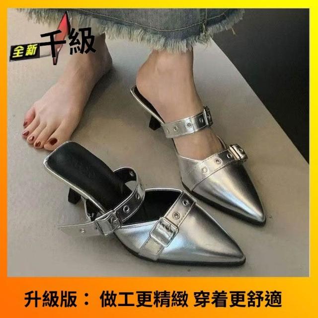 免運 免稅 尖頭細跟高跟鞋夏時尚銀色外穿高級感皮帶扣新款包頭涼拖鞋女