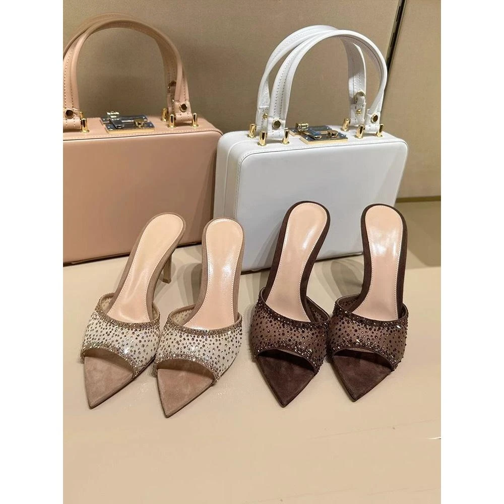 免運 免稅 2026新款露趾尖頭網紗水鉆一字拖女夏外穿氣質細跟高跟鞋涼拖鞋女