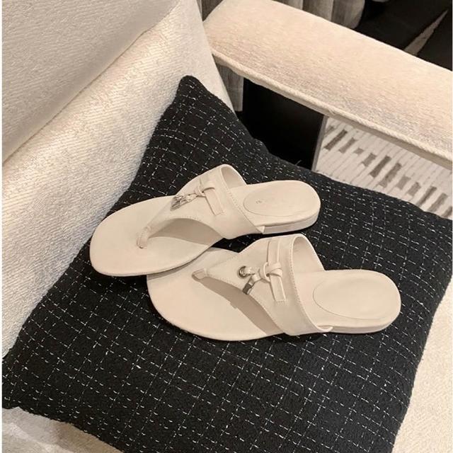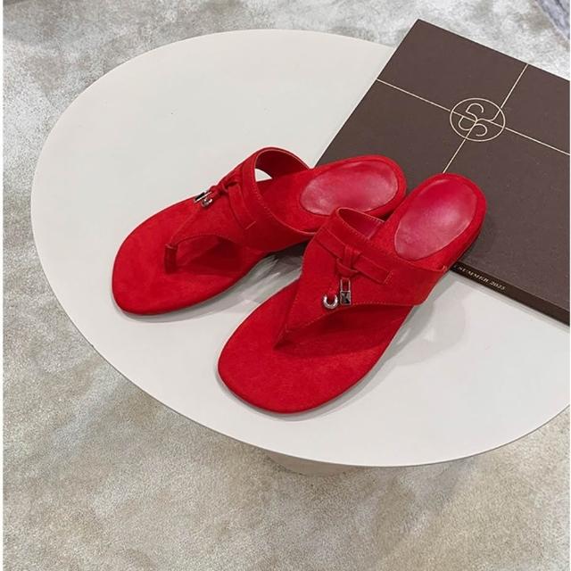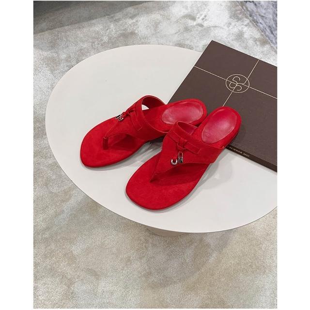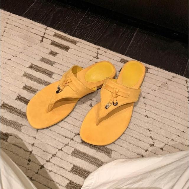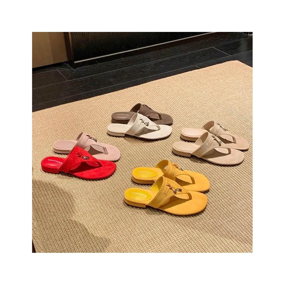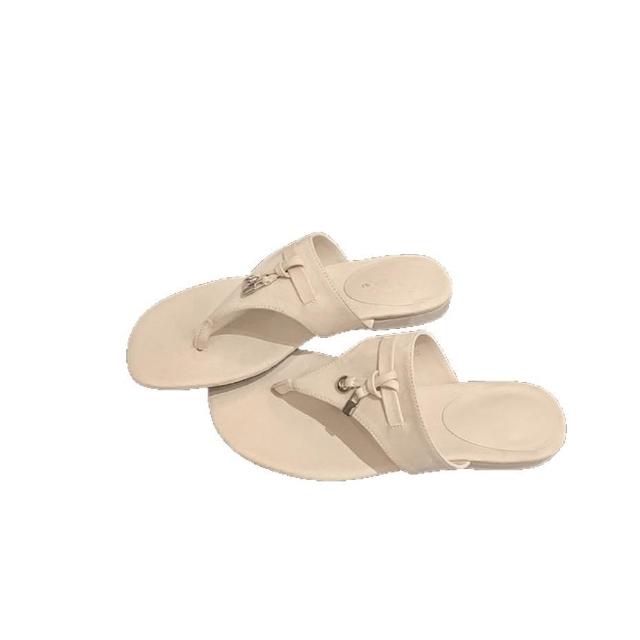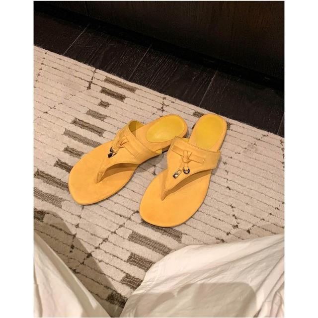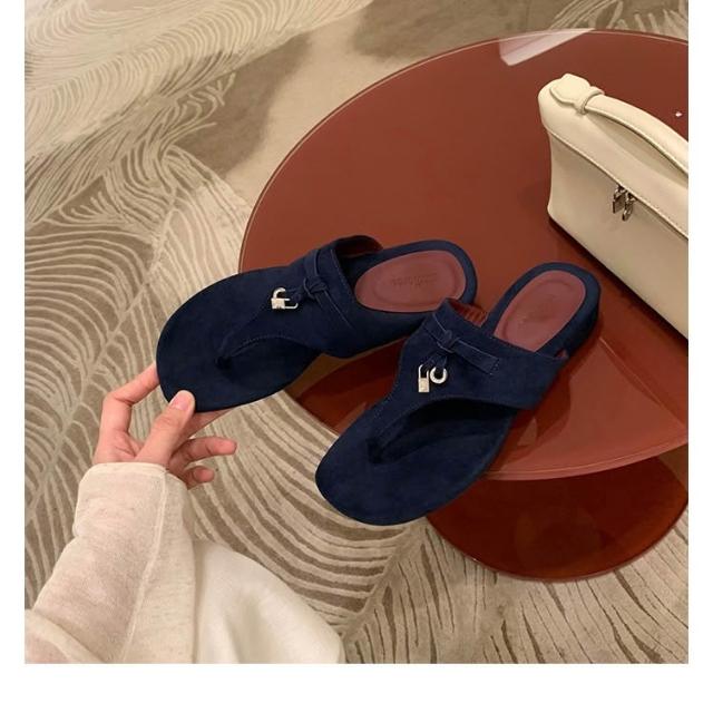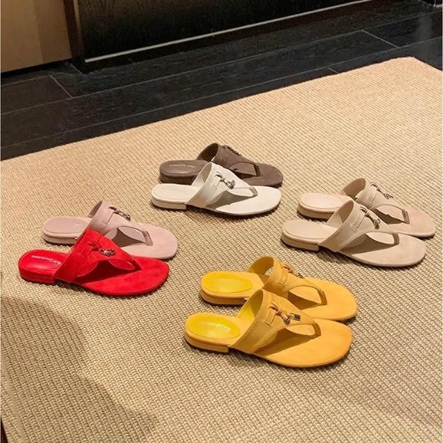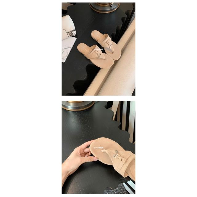 免運 免稅 小香風粗跟絨面 lp老婆拖~金屬扣流蘇夾趾平底人字涼拖鞋女外穿夏