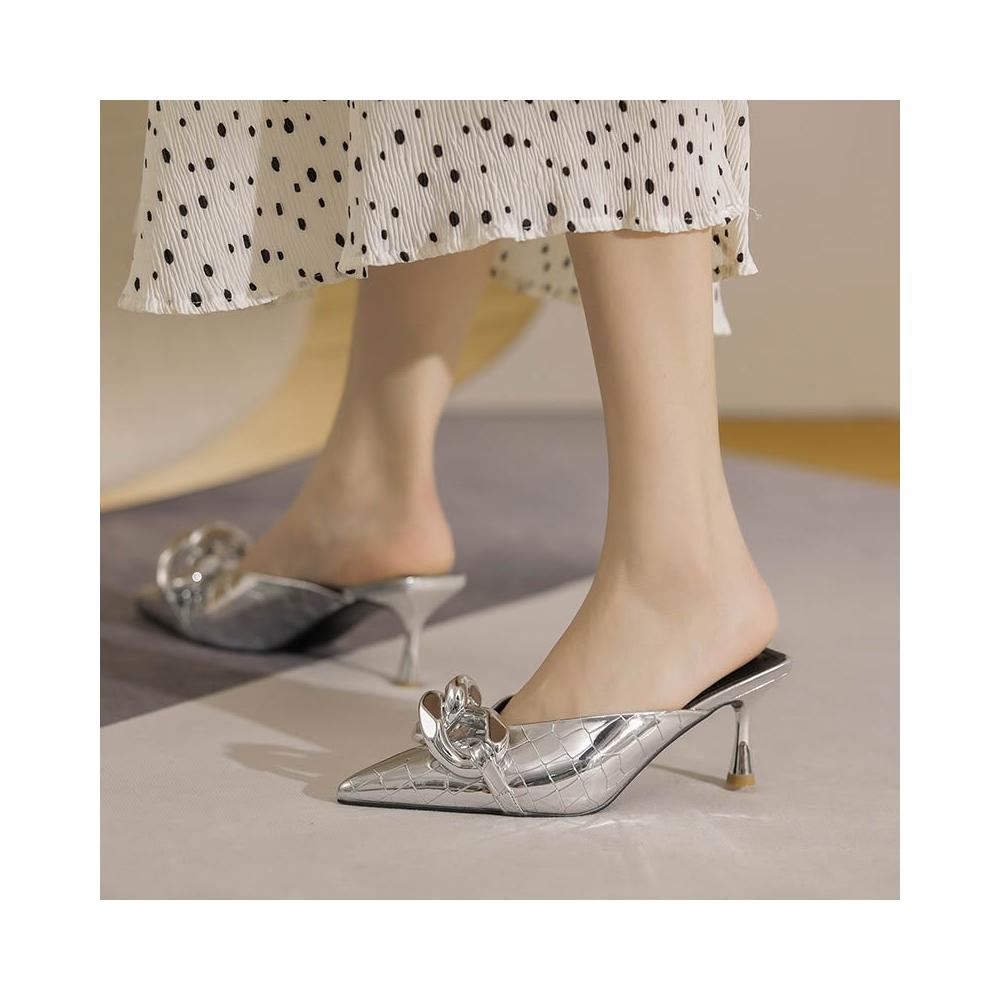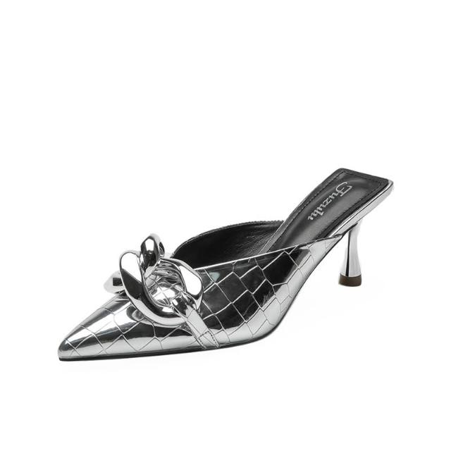 免運 免稅 涼拖鞋女外穿夏季新款高跟鞋歐美風銀色鏈條尖頭石頭紋包頭拖