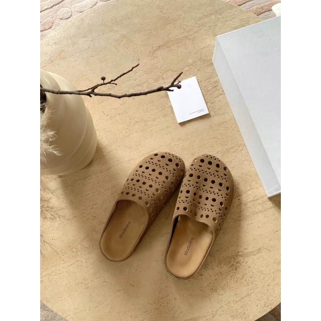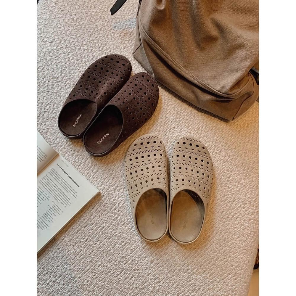 免運 免稅 牛皮版~真皮磨砂镂空雕花包頭半拖鞋女夏外穿厚底勃肯面包涼拖鞋