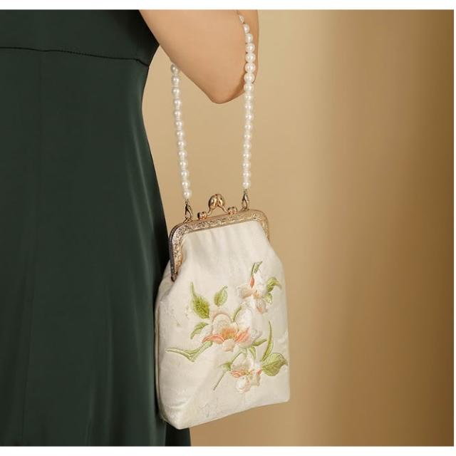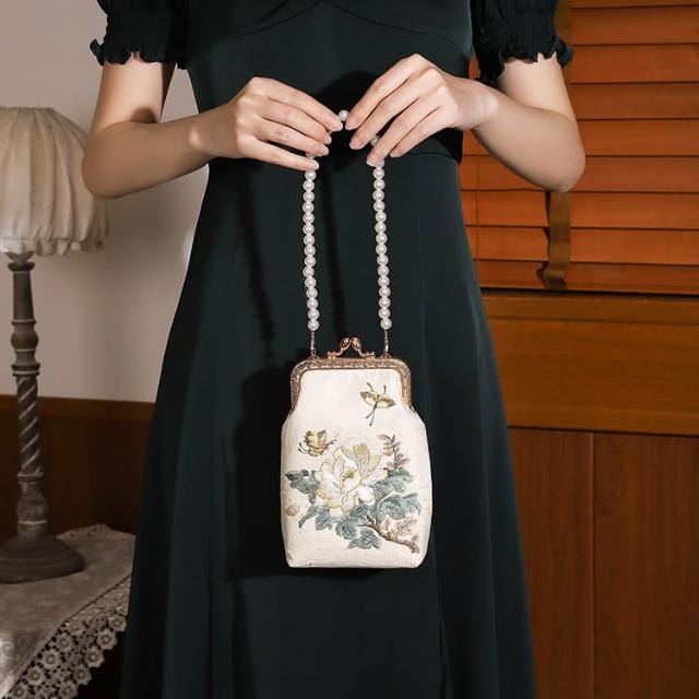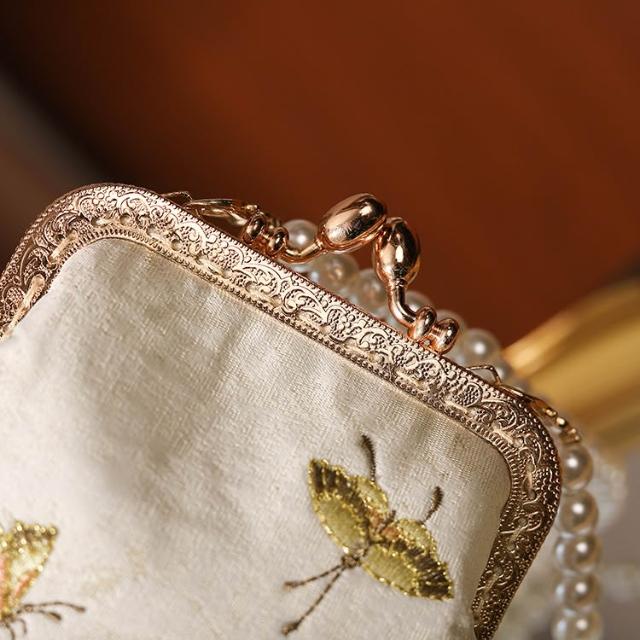 免運 免稅 珍珠繡花竹節手提包 古風旗袍宴會手拿包鏈條包 金屬鎖扣繡珠包