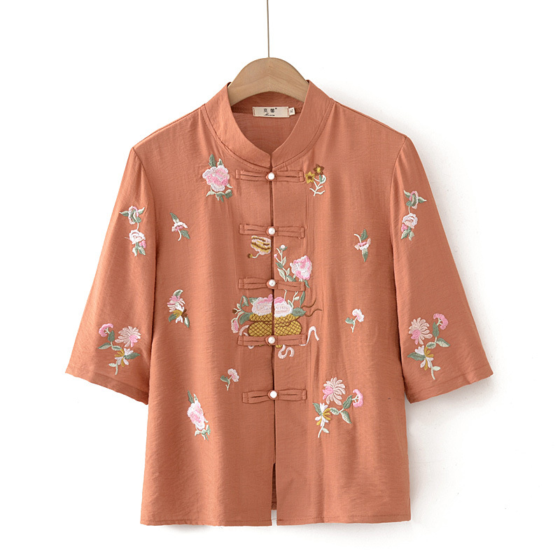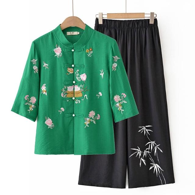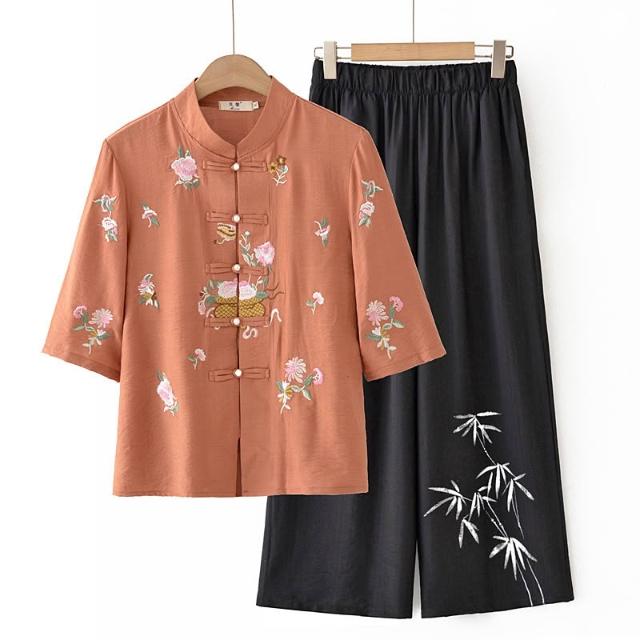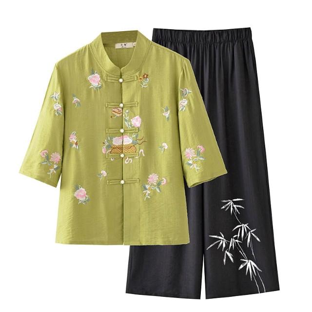 免運 免稅 大碼中老年女裝夏季寬松遮肉繡花盤扣七分袖上衣+闊腿褲套裝64815