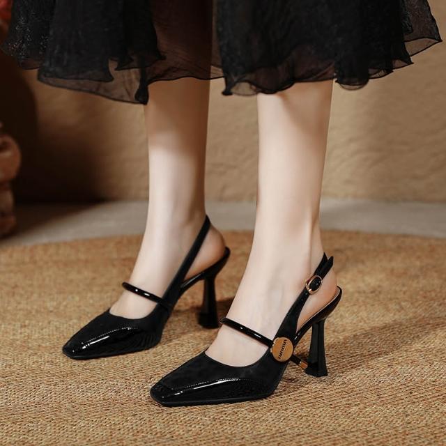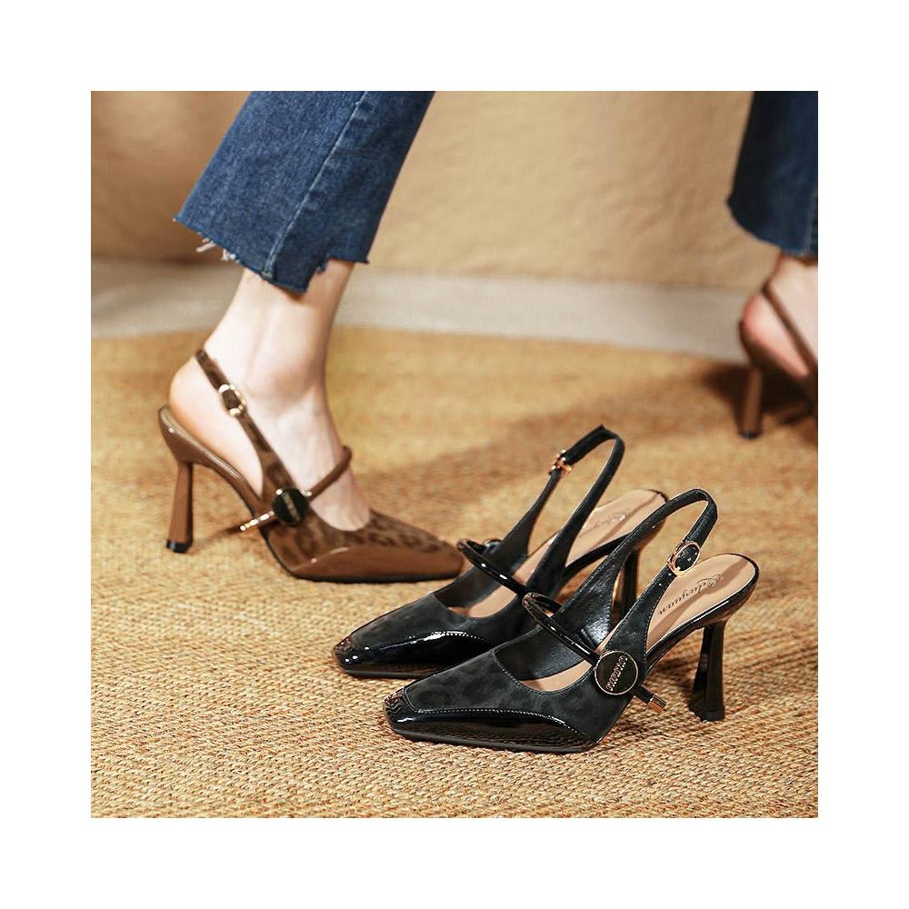 免運 免稅 包頭後空涼鞋女瑪麗珍法式棕色豹紋高跟鞋細跟夏季方頭一字帶單鞋