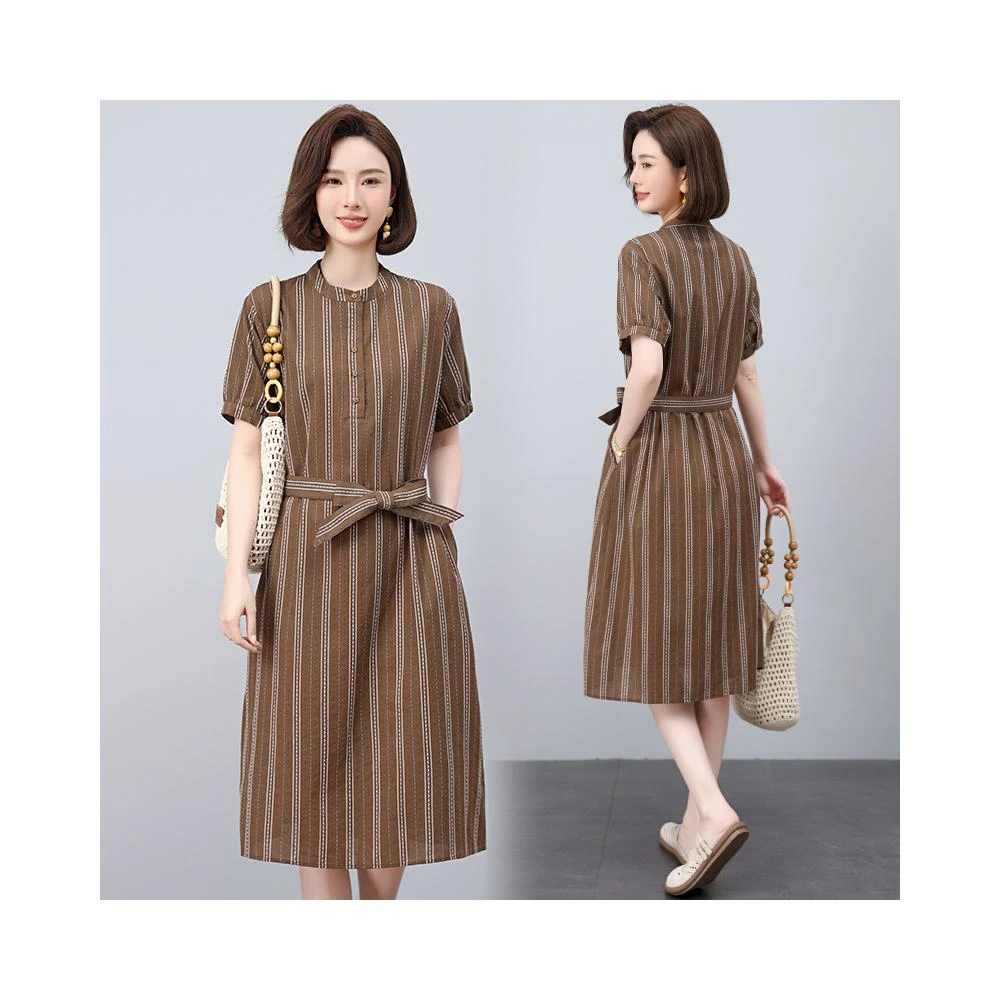 2026年夏季文藝複古優雅條紋中長款媽媽連衣裙舒适圓領連衣裙設計感