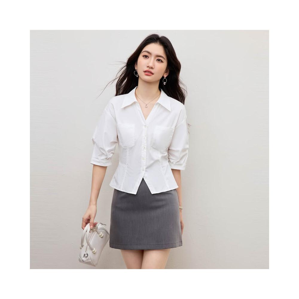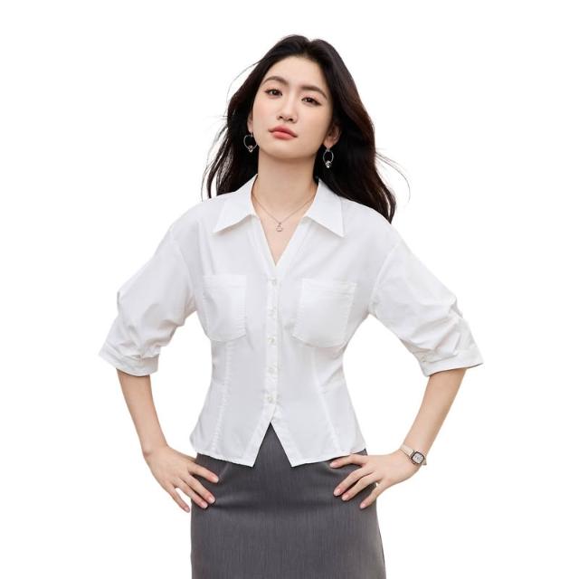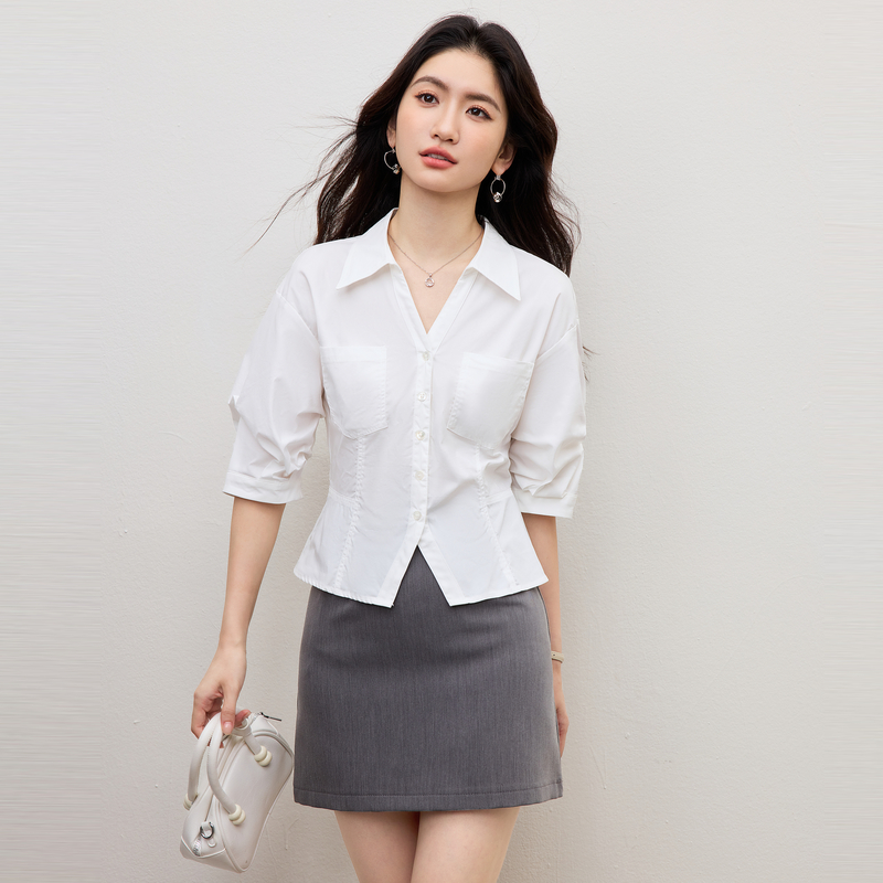 素行紀元白色收腰襯衫女夏裝新款高級通勤職業感減齡法式泡泡袖上衣