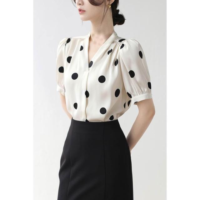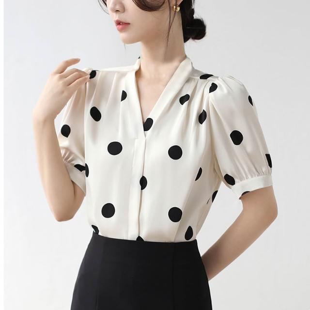 素行紀元法式複古波點V領襯衫短袖女2026夏季新款玫瑰花系帶緞面通勤上衣
