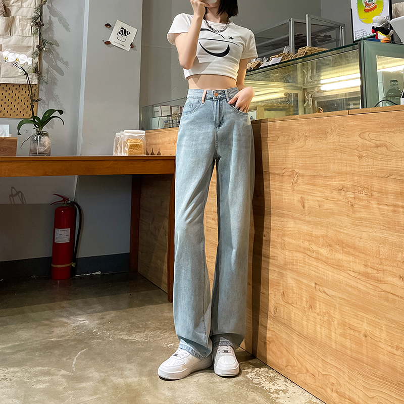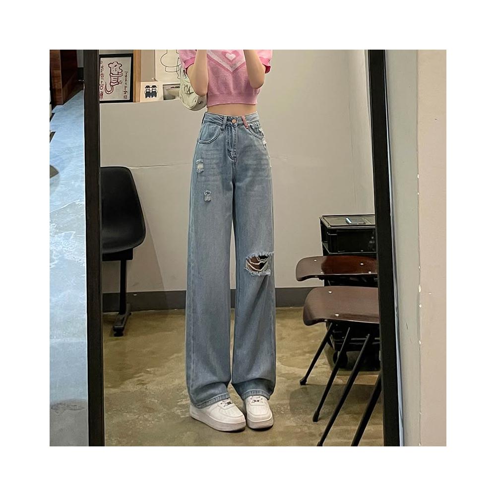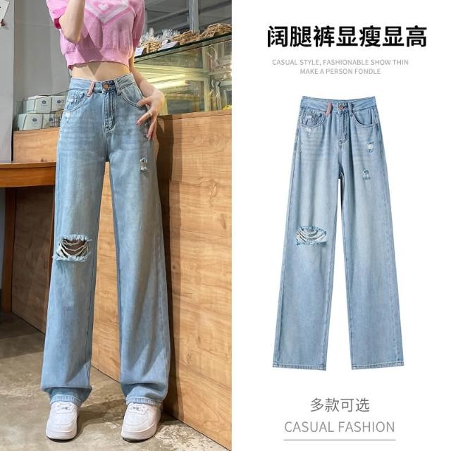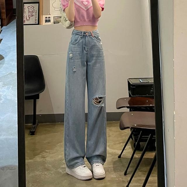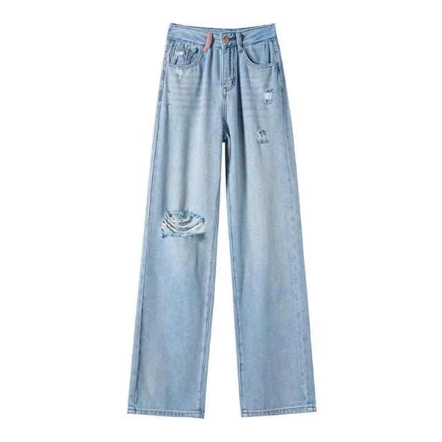 素行紀元2025刺繡破洞闊腿牛仔褲女春夏高腰寬松顯瘦直筒褲子