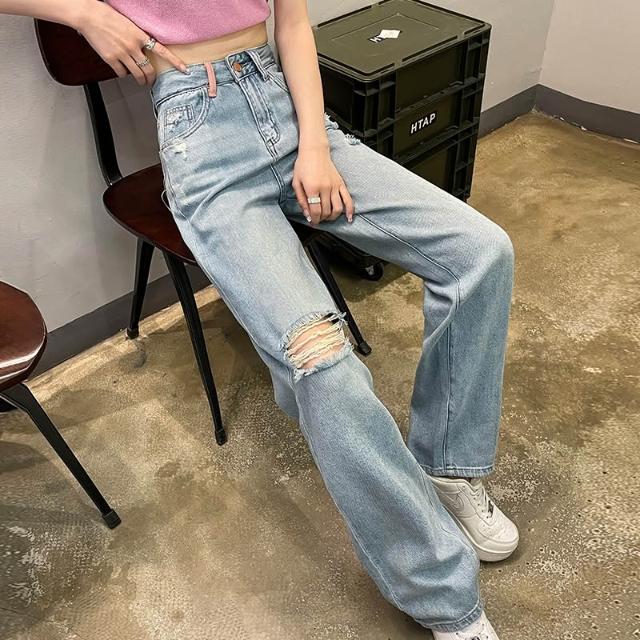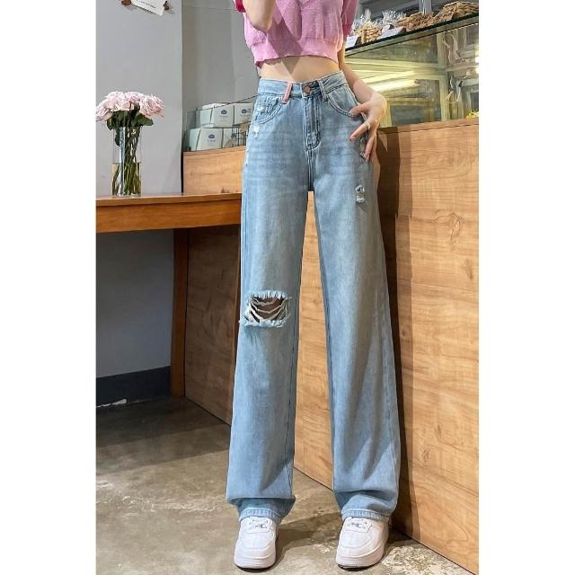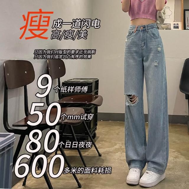 素行紀元2025刺繡破洞闊腿牛仔褲女春夏高腰寬松顯瘦直筒褲子