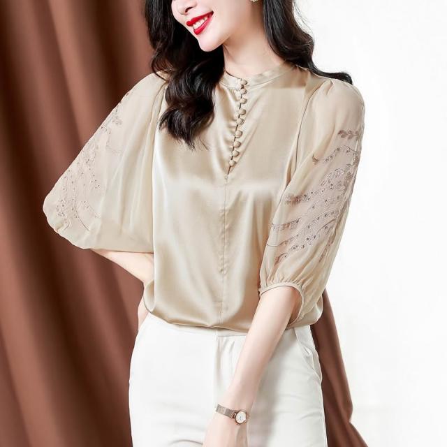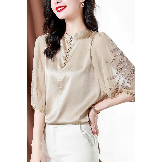素行紀元實拍高端緞面真絲襯衫女夏季2022新款寬松設計感刺繡燈籠袖桑蠶絲