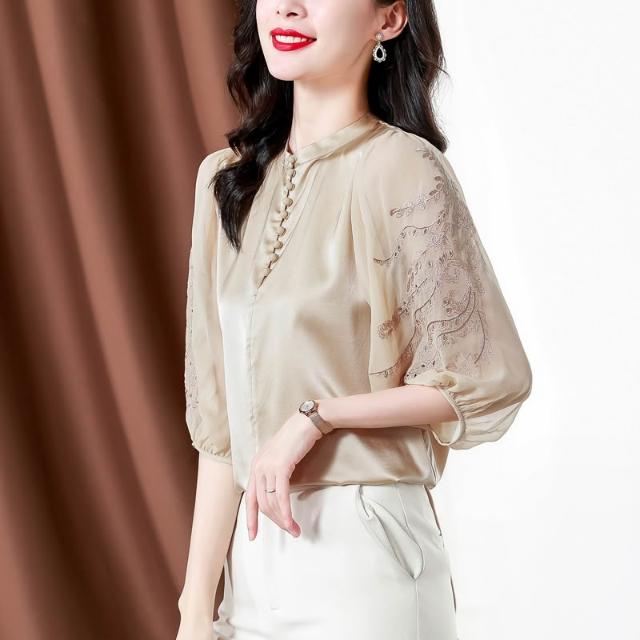 素行紀元實拍高端緞面真絲襯衫女夏季2022新款寬松設計感刺繡燈籠袖桑蠶絲