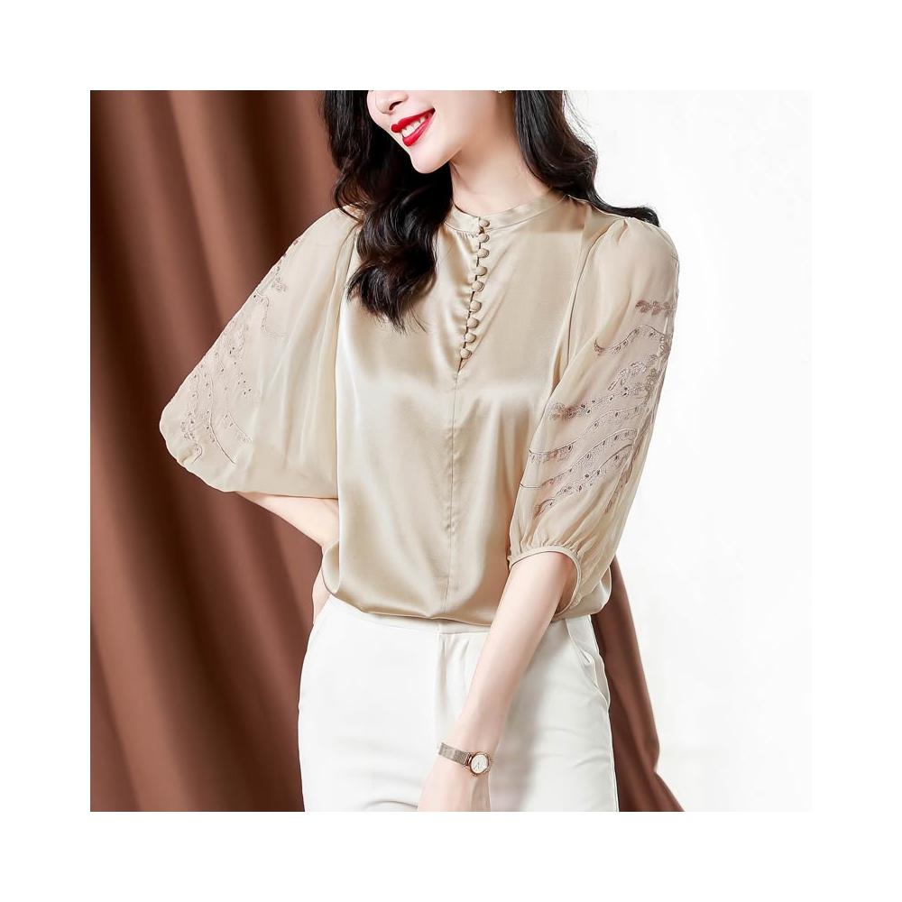 素行紀元實拍高端緞面真絲襯衫女夏季2022新款寬松設計感刺繡燈籠袖桑蠶絲