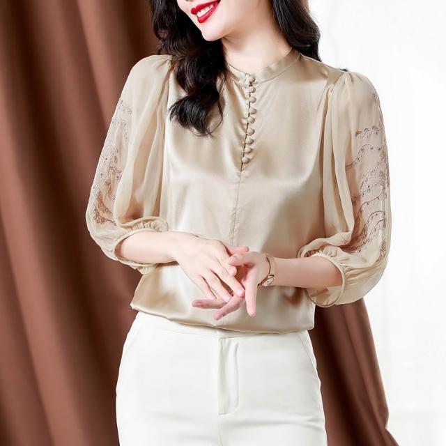 素行紀元實拍高端緞面真絲襯衫女夏季2026新款寬松設計感刺繡燈籠袖桑蠶絲