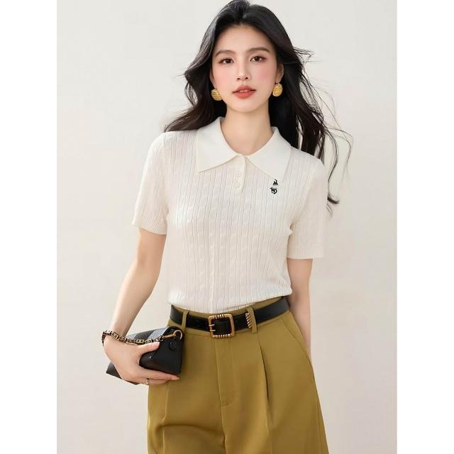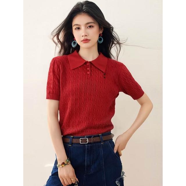 素行紀元短袖針織衫2026春季新品翻領絞花紅色短袖套頭針織衫