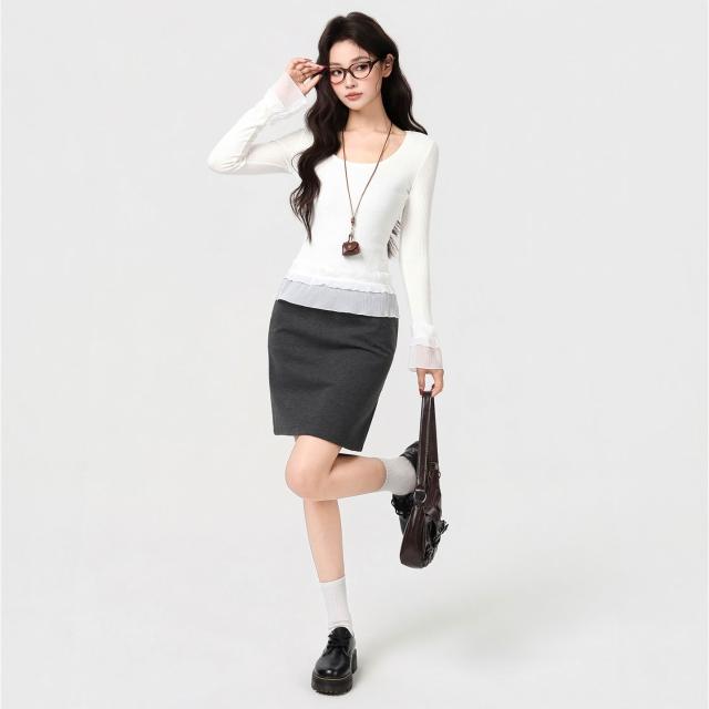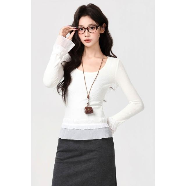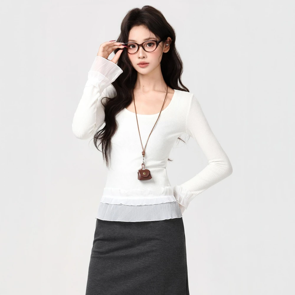 素行紀元2026實拍實價韓系U領蕾絲花邊下擺長袖T恤秋冬穿搭新款打底衫内搭上衣