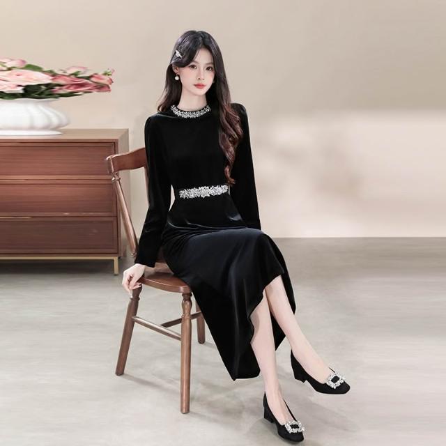 素行紀元高級感晚禮服重工鑲鑽氣質黑色絲絨連衣裙配腰帶7215