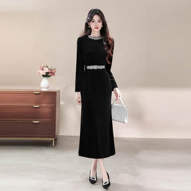 素行紀元高級感晚禮服重工鑲鑽氣質黑色絲絨連衣裙配腰帶7215