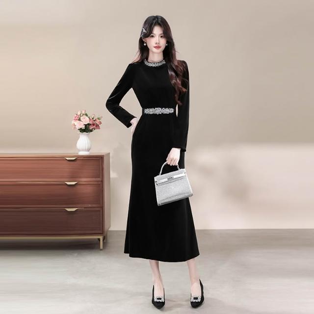 素行紀元高級感晚禮服重工鑲鑽氣質黑色絲絨連衣裙配腰帶7215