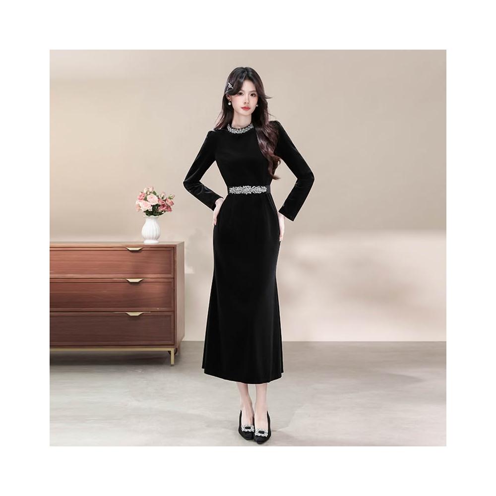 素行紀元高級感晚禮服重工鑲鑽氣質黑色絲絨連衣裙配腰帶7215