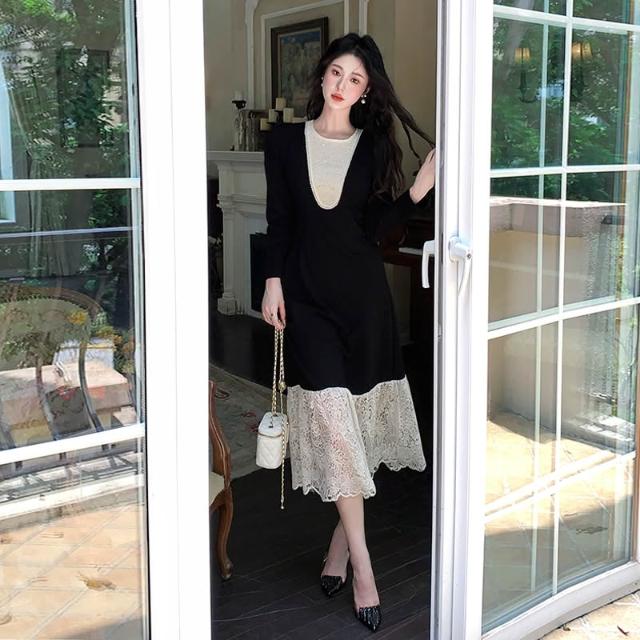 素行紀元黑色赫本風法式蕾絲拼接高級氣質顯瘦連衣裙7169