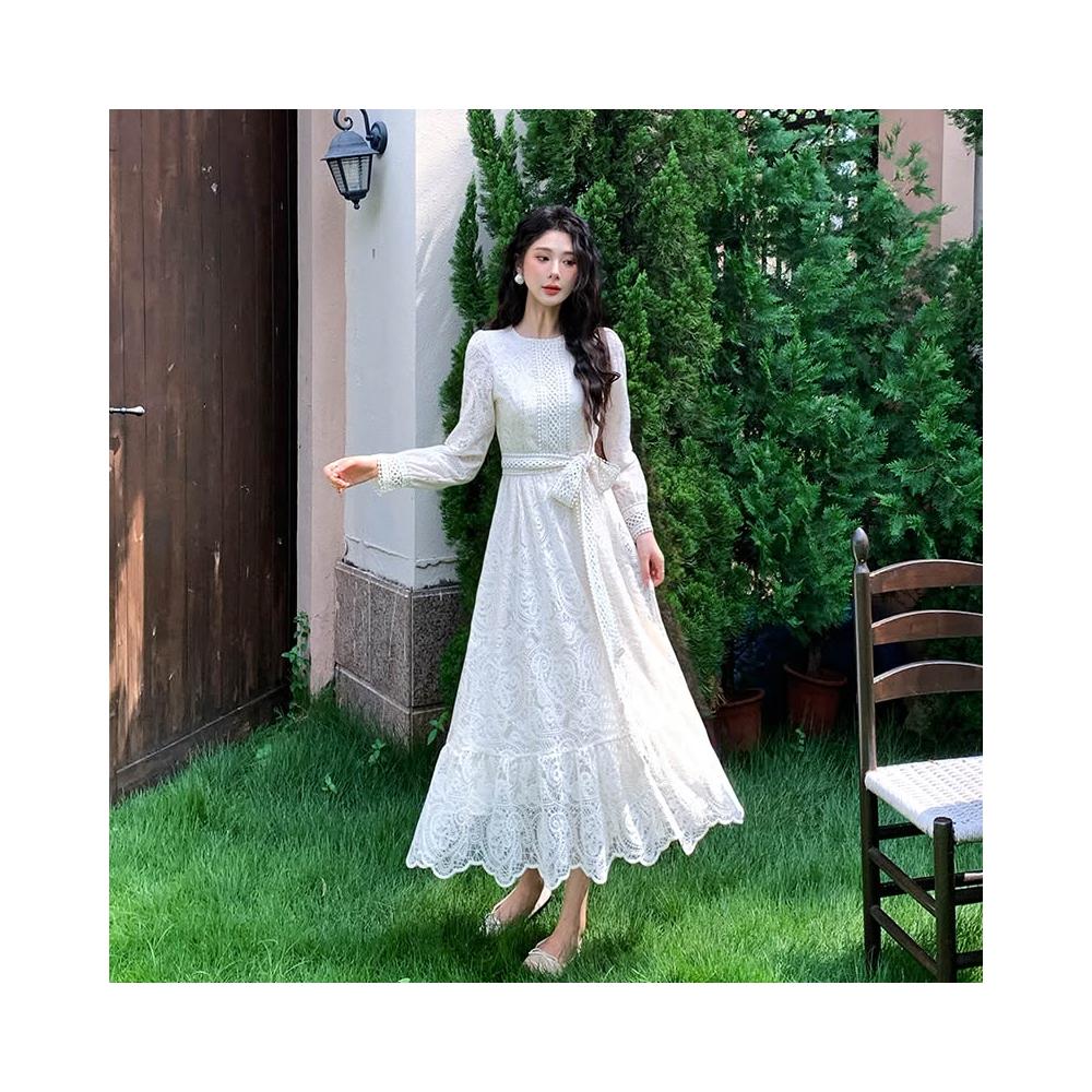 素行紀元新款圓領長袖水溶花收腰顯瘦蕾絲連衣裙長裙7139