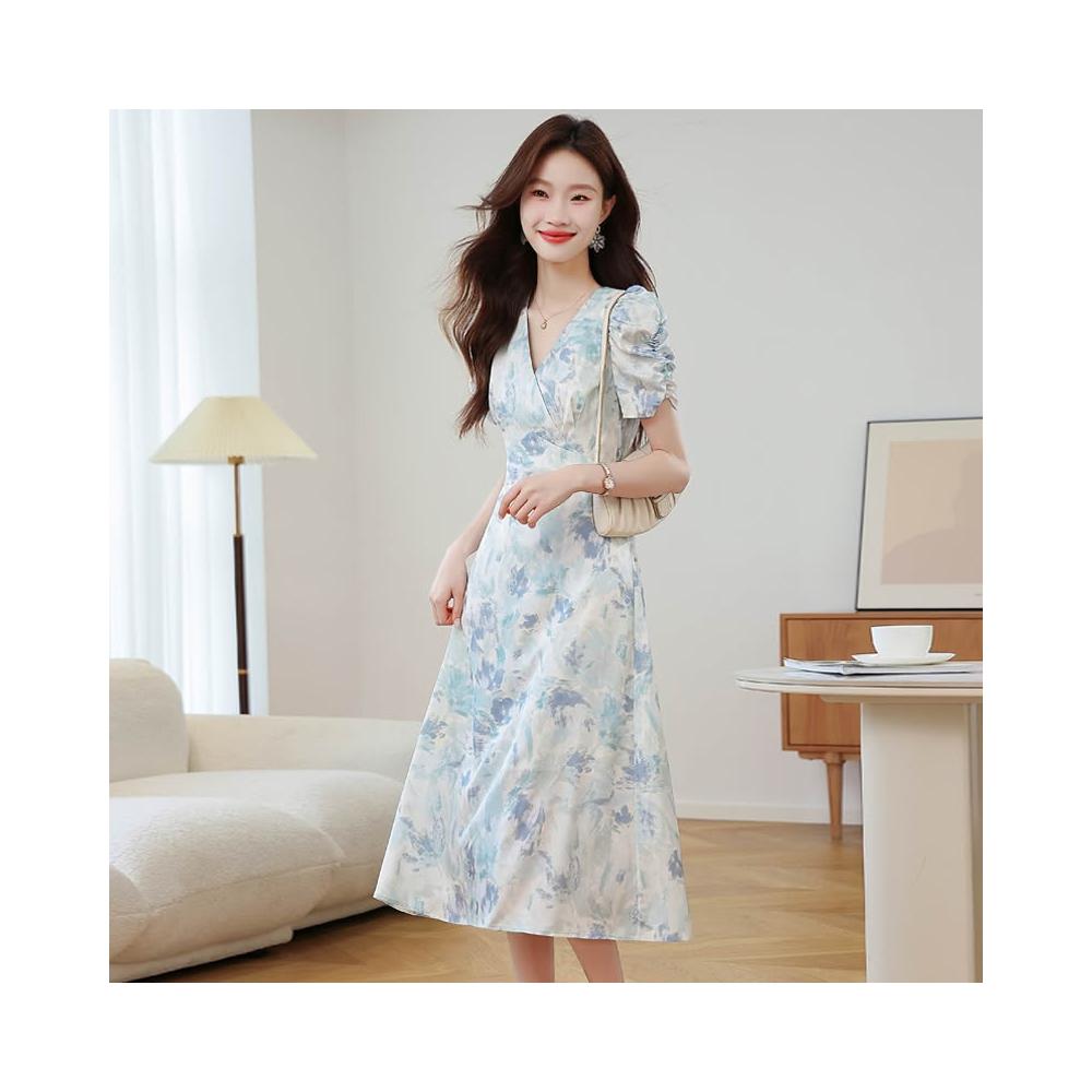 素行紀元2026實拍月下白提花泡泡袖a字連衣裙夏季新款V領花色長裙