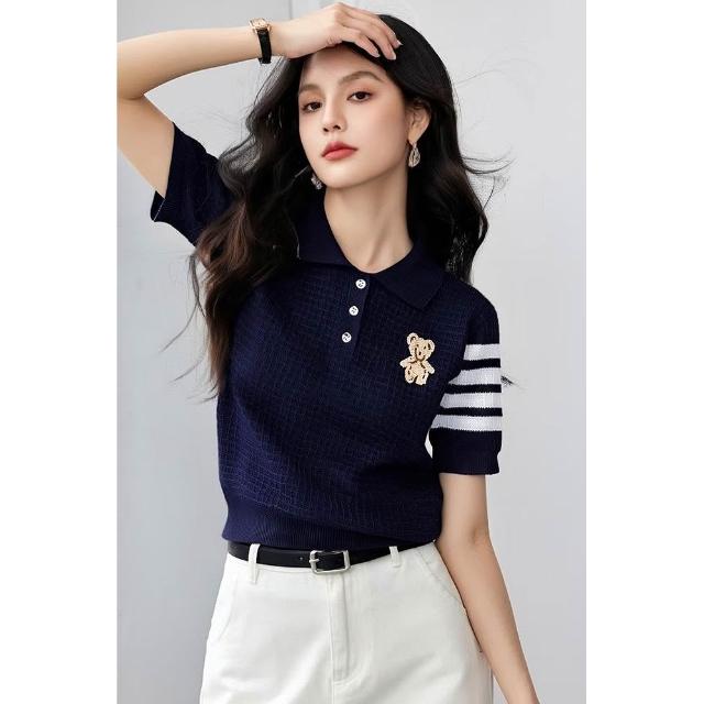 素行紀元實拍有2026夏季新款小熊刺繡翻領針織短袖POLO領格紋上衣
