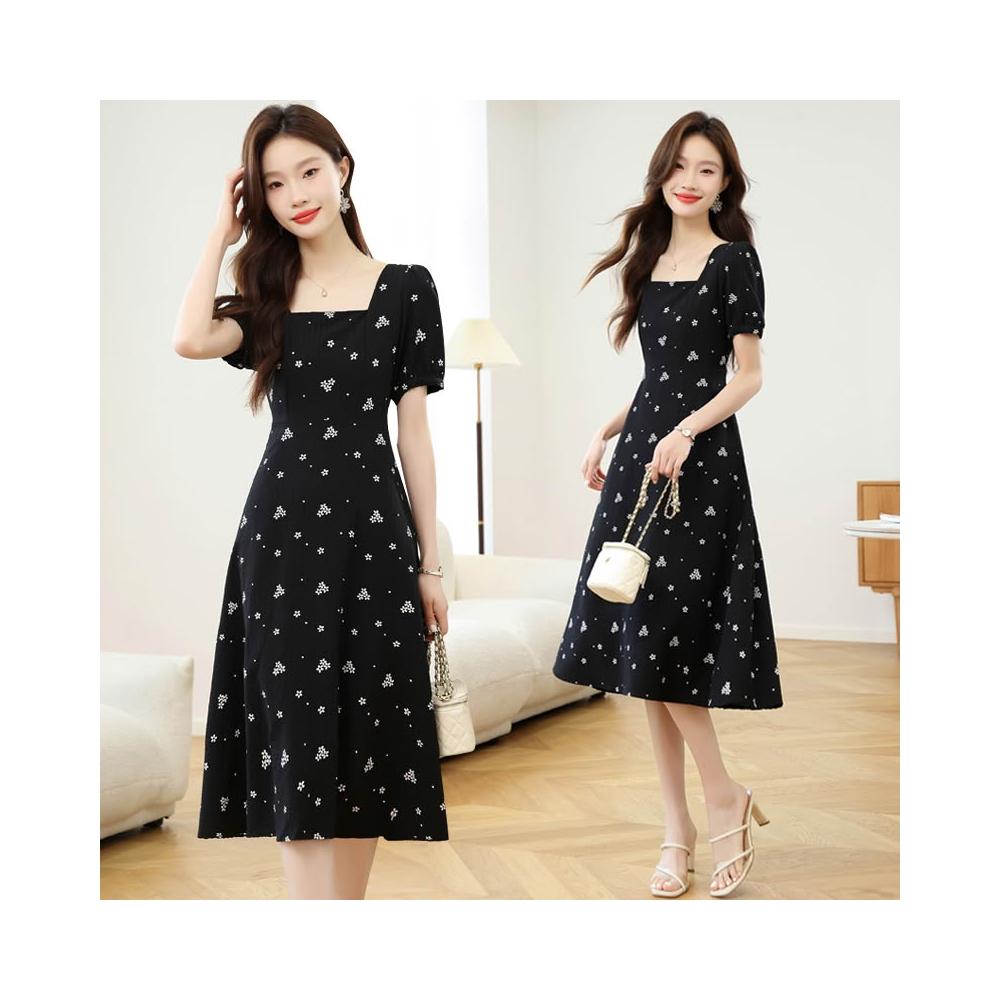 素行紀元實拍黑色赫本風碎花連衣裙女夏新款法式收腰顯瘦方領雪紡a字裙子