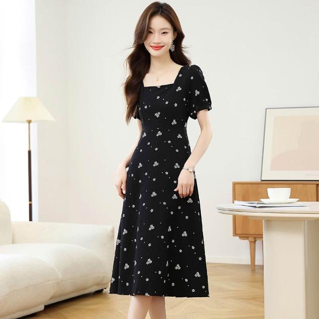 素行紀元實拍黑色赫本風碎花連衣裙女夏新款法式收腰顯瘦方領雪紡a字裙子