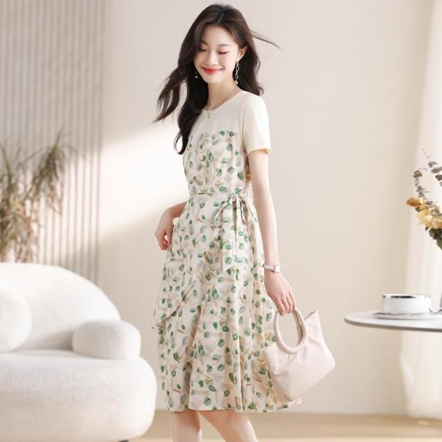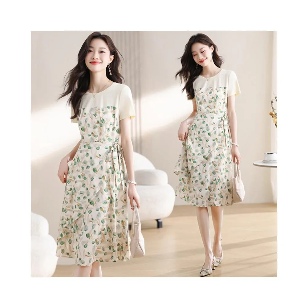 素行紀元實拍假兩件碎花連衣裙女2025夏季新款短袖郁金香印花荷葉邊裙子