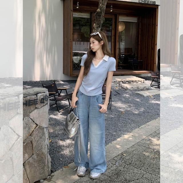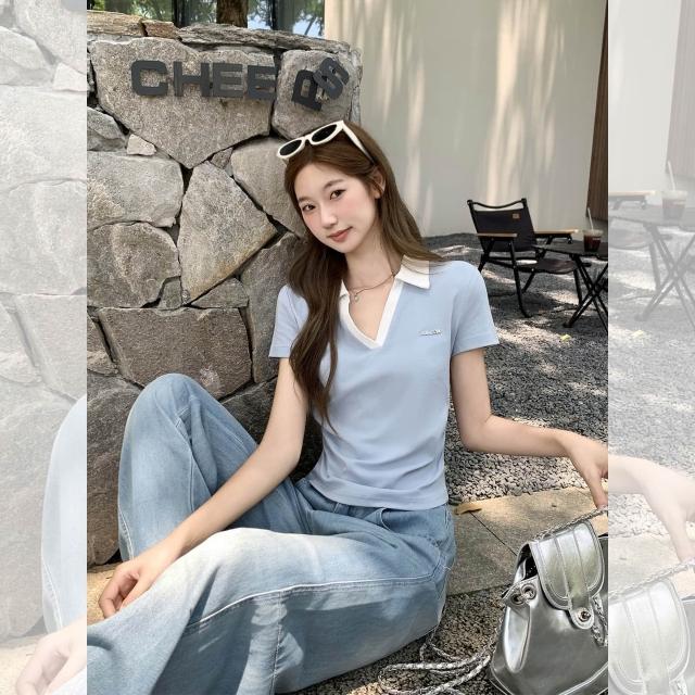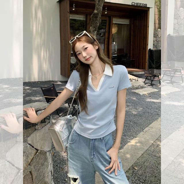 素行紀元實拍實價韓系polo撞色翻領短袖t恤女夏季新款褶皺收腰獨特别上衣