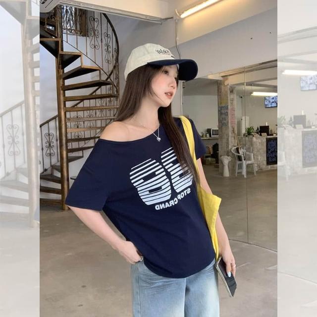 素行紀元實拍實價美式複古斜肩短袖t恤女夏季2026新款寬松慵懶露肩小上衣