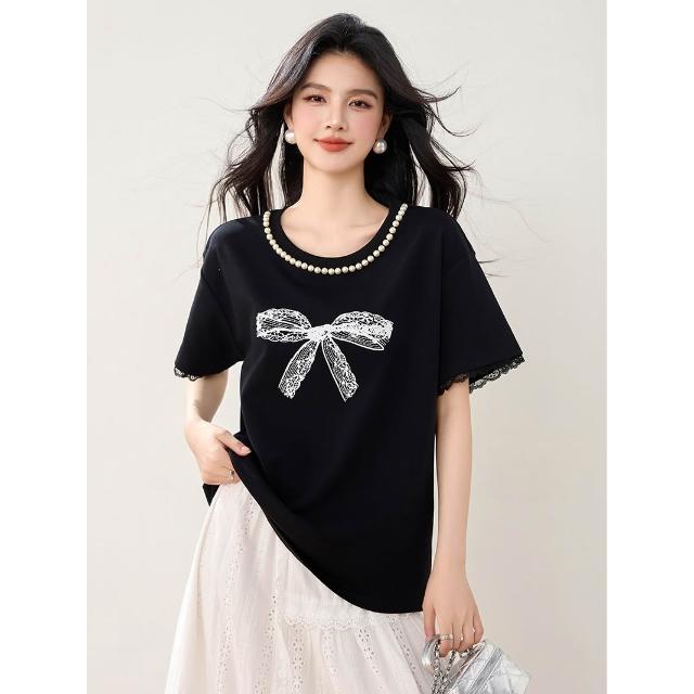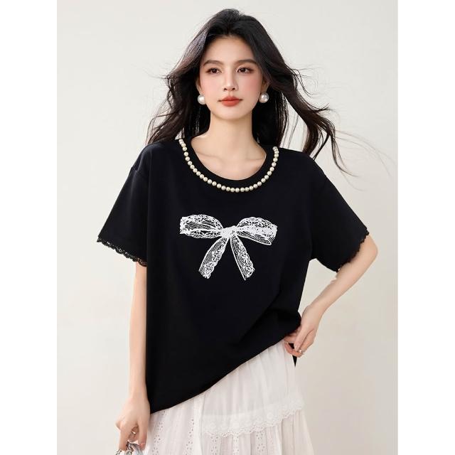 素行紀元實拍黑色蝴蝶結短袖蕾絲花邊T恤女夏季新款重工寬松遮肚上衣
