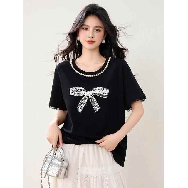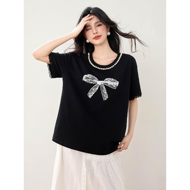素行紀元實拍黑色蝴蝶結短袖蕾絲花邊T恤女夏季新款重工寬松遮肚上衣