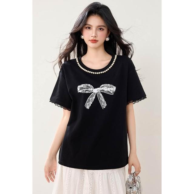 素行紀元實拍黑色蝴蝶結短袖蕾絲花邊T恤女夏季新款重工寬松遮肚上衣