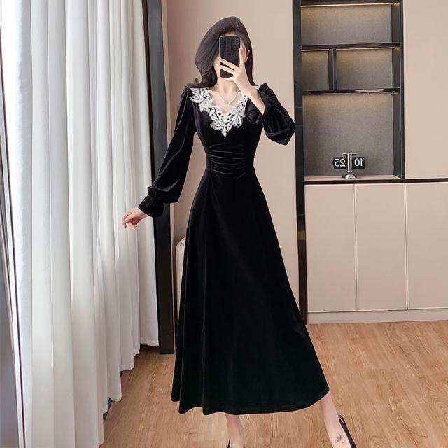 素行紀元别致花邊V領絲絨連衣裙法式收腰a字長裙固色不掉色6913