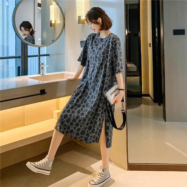 素行紀元實拍 夏新款/大碼寬松開叉寬松長款豹紋T裙連衣裙