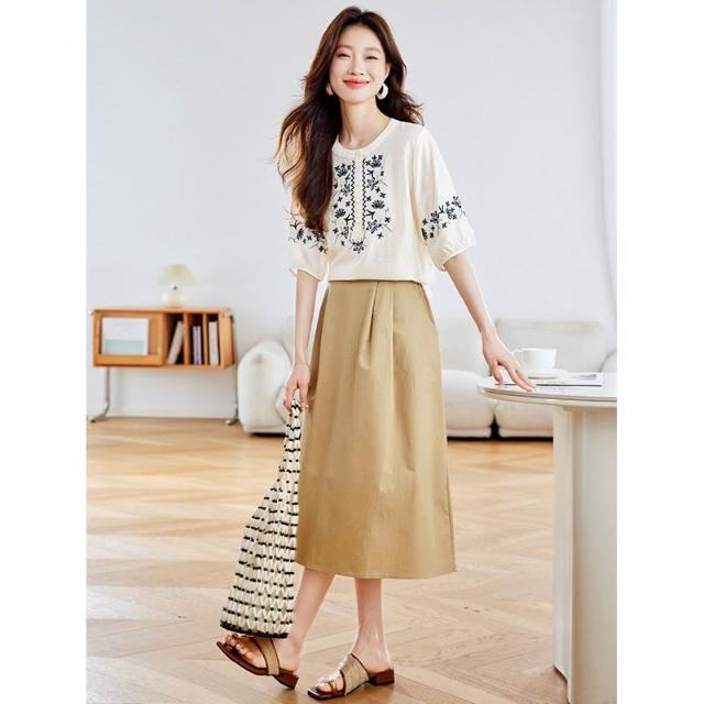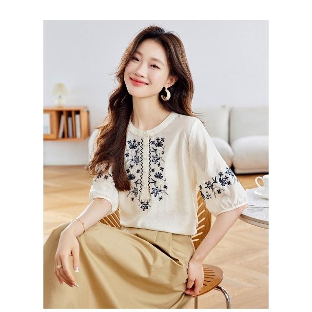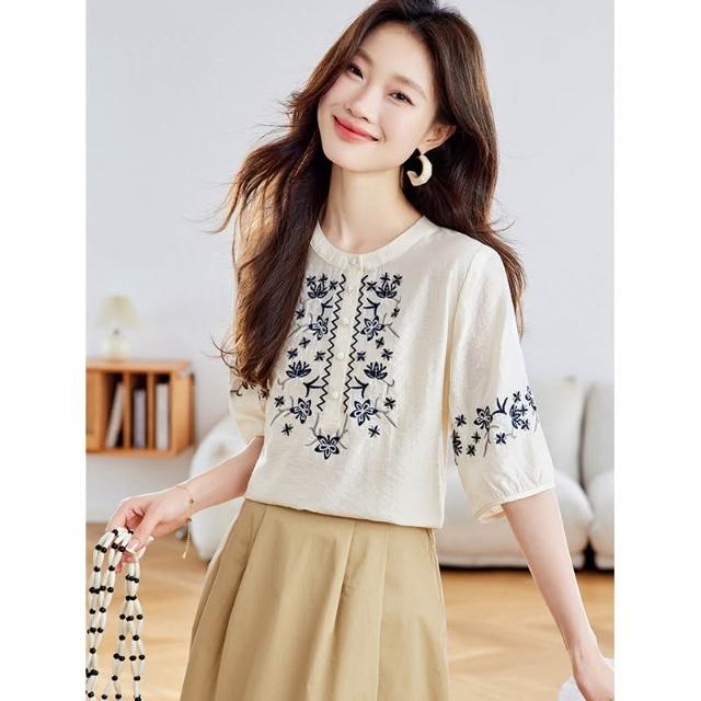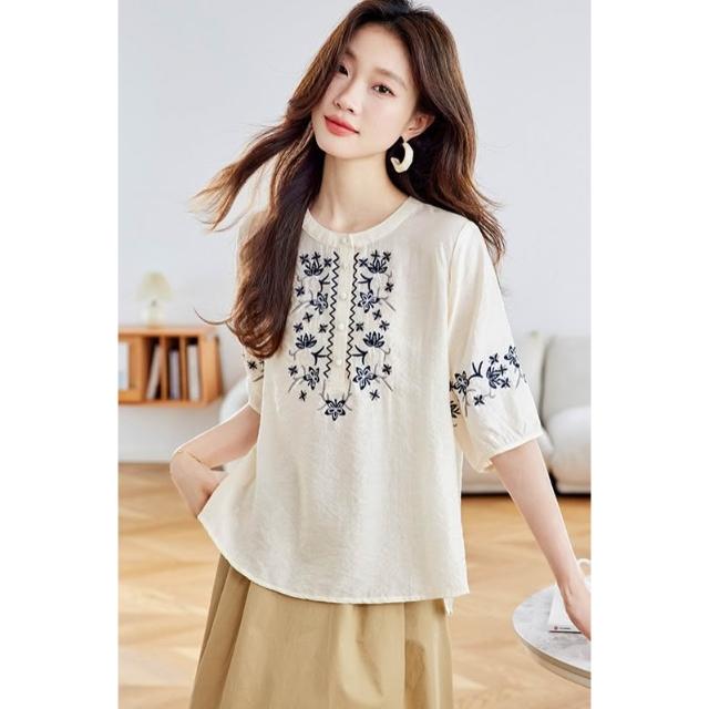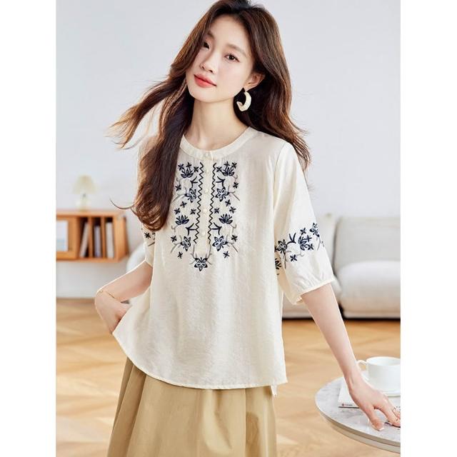 素行紀元2026新款夏季寬松獨特漂亮小衫減齡上衣民族風刺繡圓領短袖襯衫女