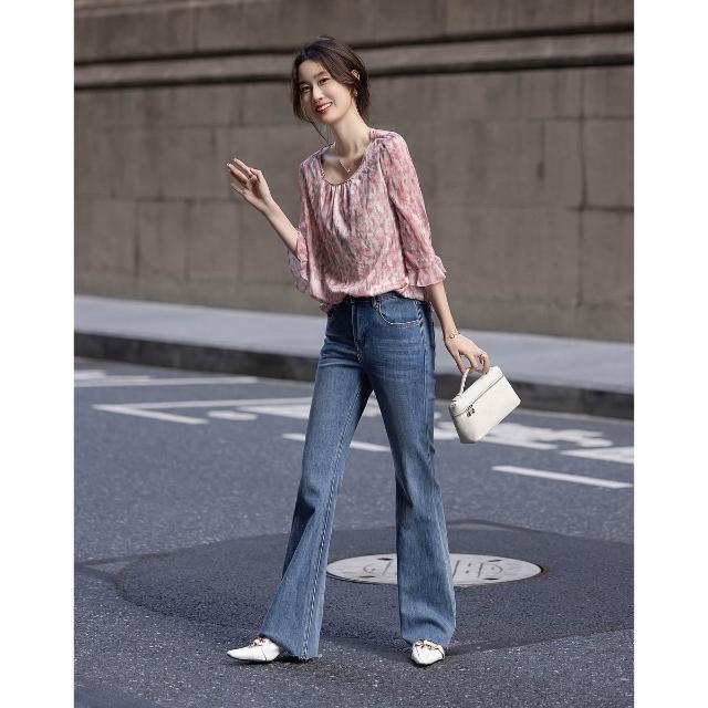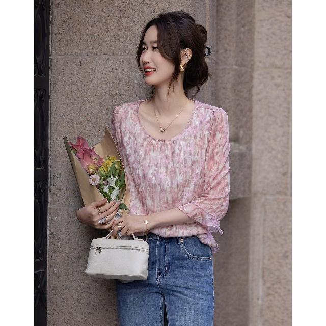 素行紀元藝術暈染植物印花春季飄逸荷葉袖襯衫順滑舒适藏肉襯衣女上衣