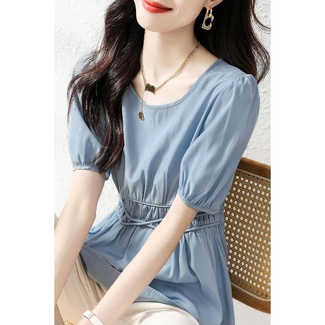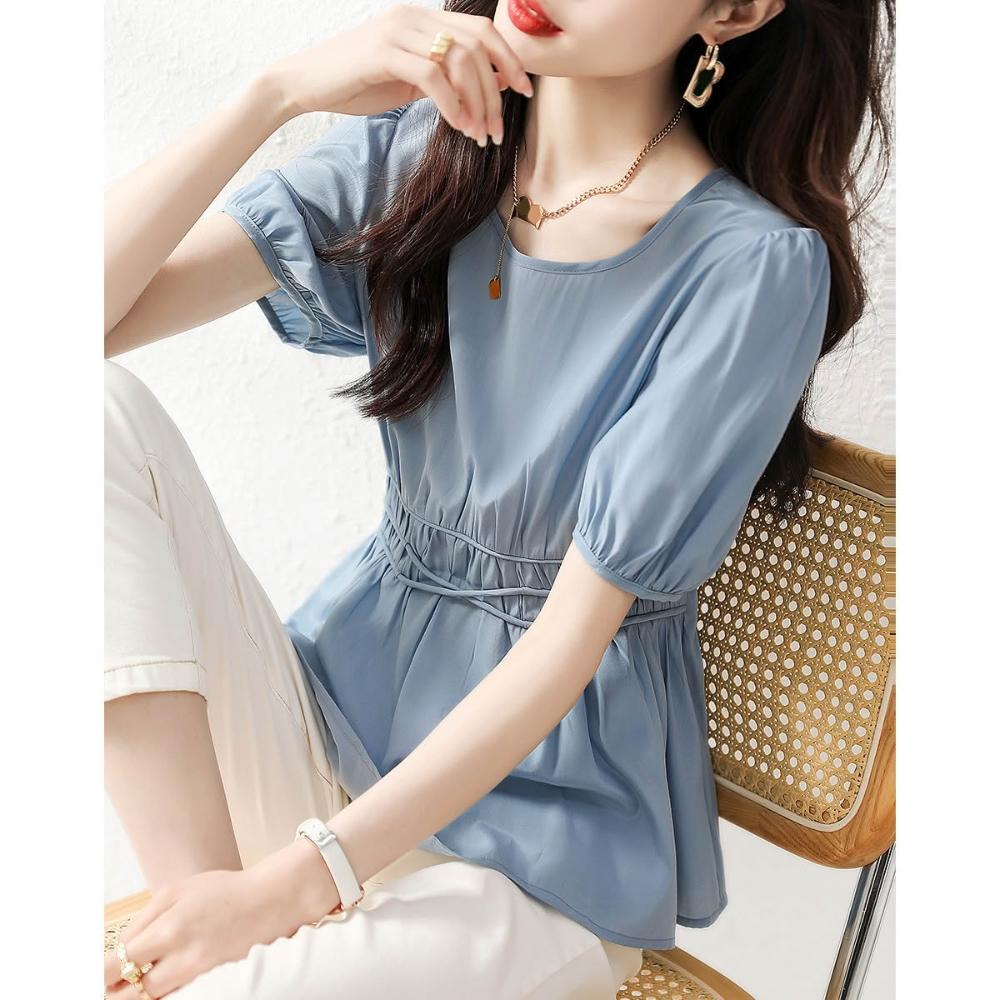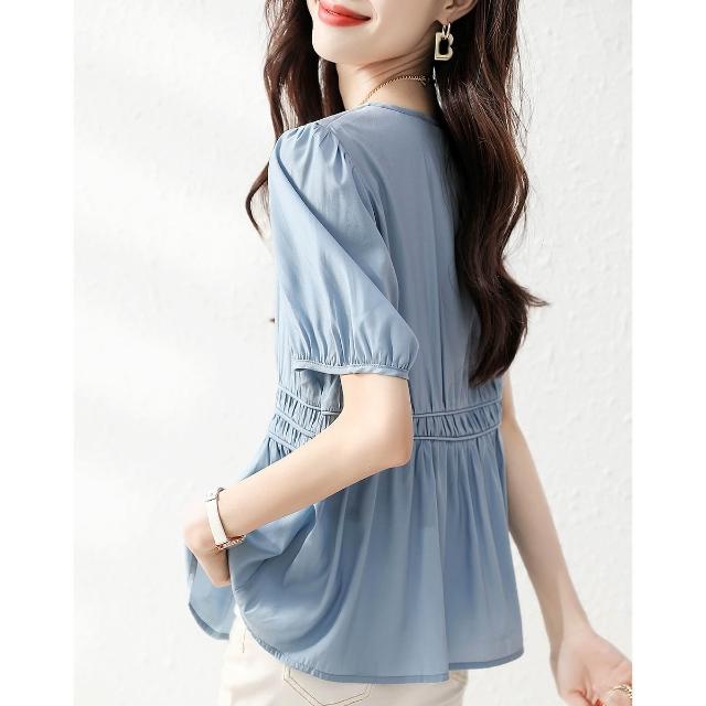 素行紀元夏季泡泡袖V領休閑收腰顯瘦韓版精致通勤氣質顯腰身短袖襯衫