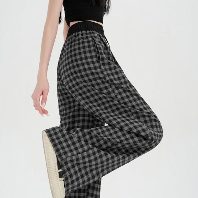 素行紀元實拍黑白格子闊腿褲女夏季新款高腰直筒寬松休閑慵懶松弛感長褲子