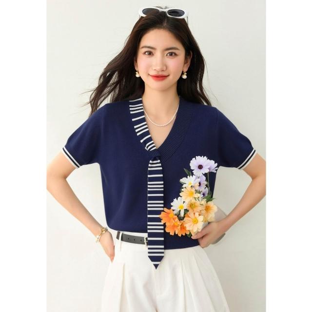 素行紀元實拍◆有◆複古海軍領條紋領帶撞色針織短袖女2026夏季修身上衣