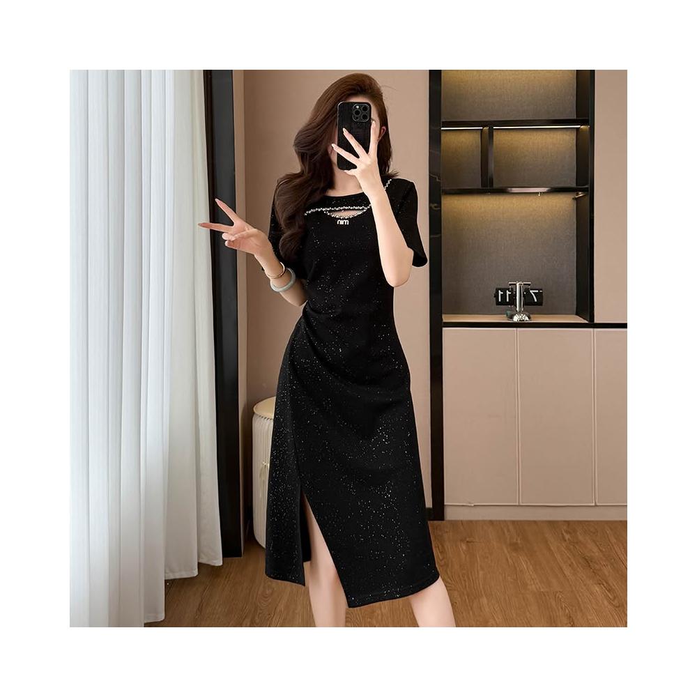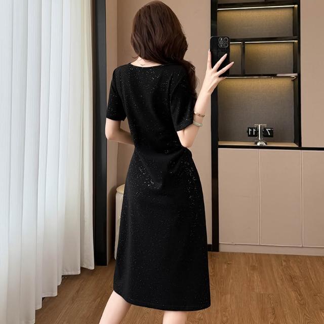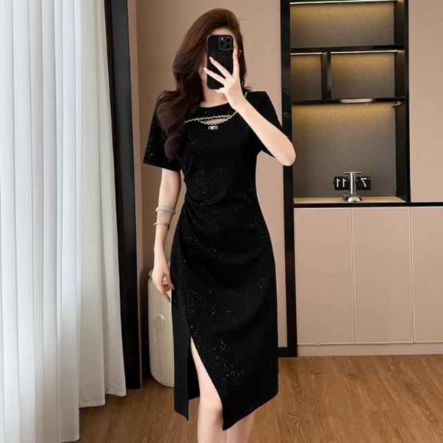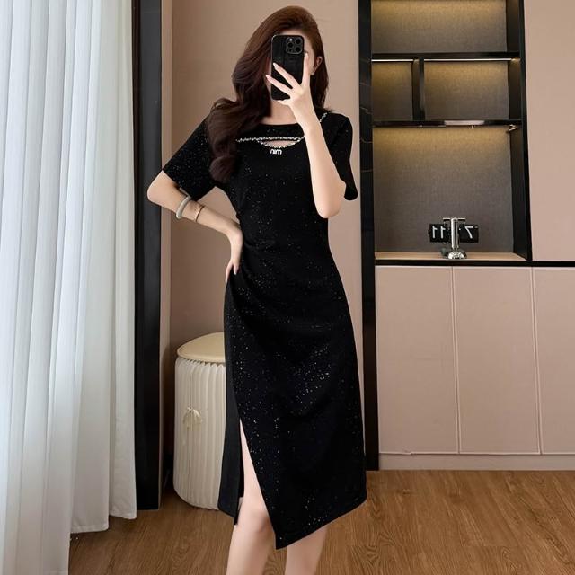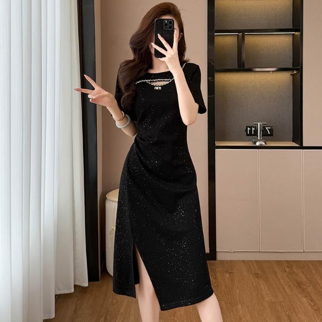 素行紀元亮晶晶氣質顯瘦收腰中長款大碼女裝胖mm短袖夏季連衣裙黑色開叉裙