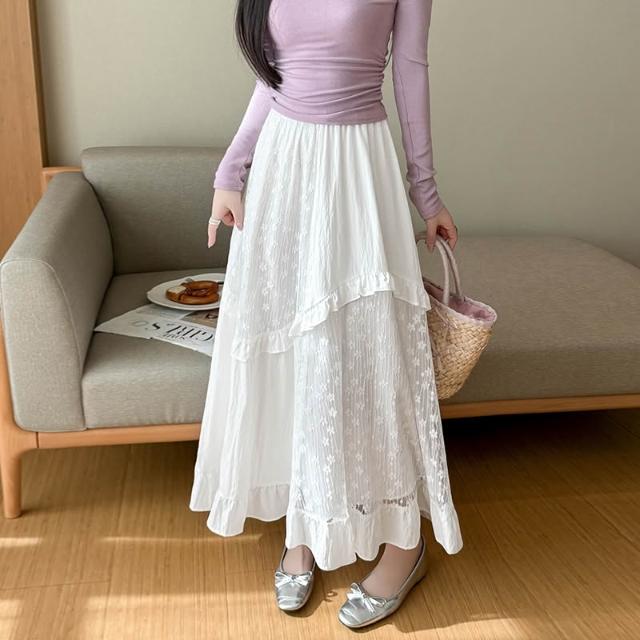 素行紀元白色中長款半身裙女2026春夏新款蕾絲拼接荷葉邊a字蛋糕裙長裙
