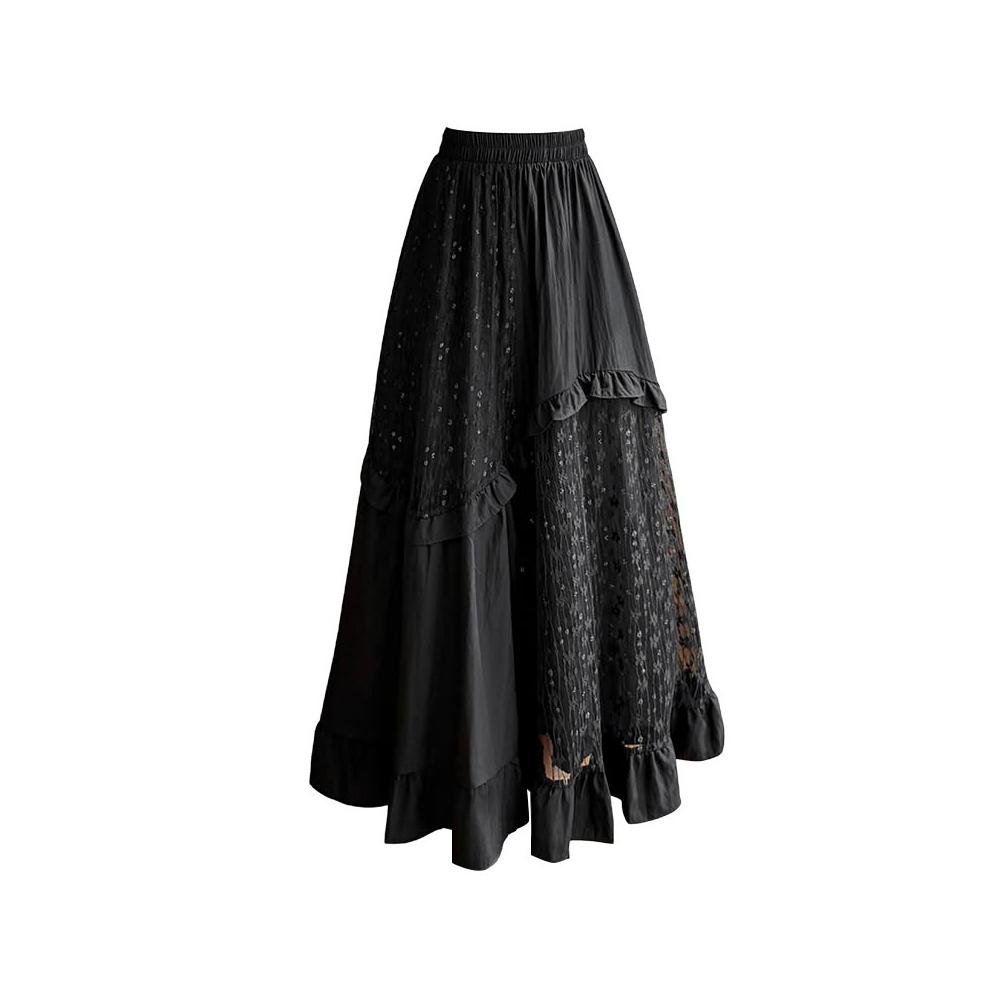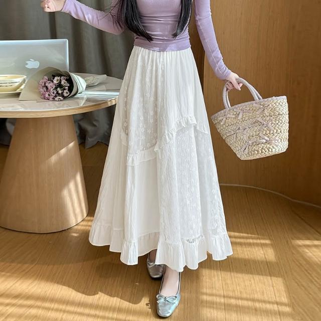 素行紀元白色中長款半身裙女2026春夏新款蕾絲拼接荷葉邊a字蛋糕裙長裙